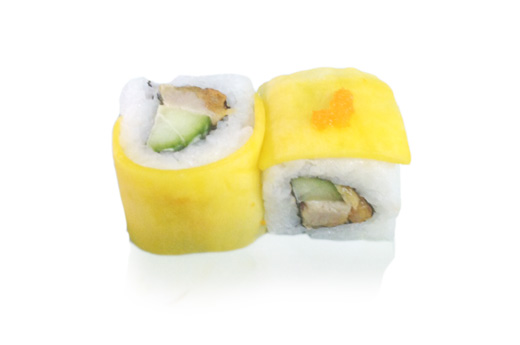 Mango jaune (poulet pané, concombre, mayonnaise enroulés de mangue et massago)
