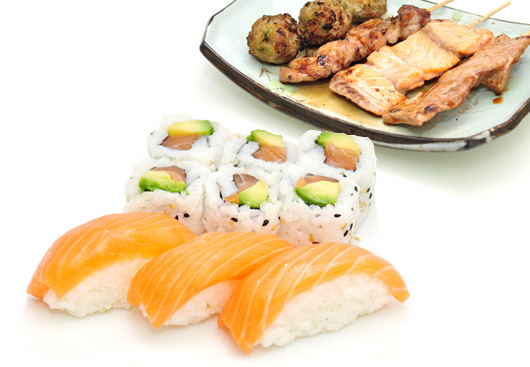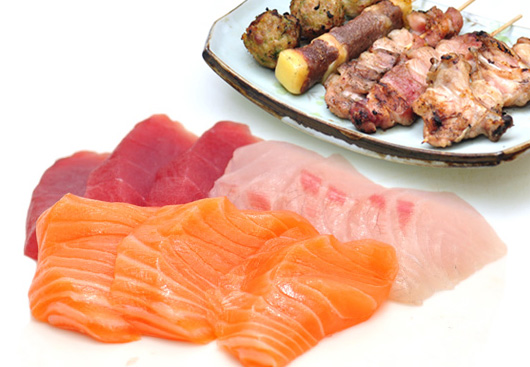 1 Soupe, 1 Salade, 1 Riz, 9 Sashimi (3 saumon, 3 thon, 3 daurade), 5 Brochettes (1 boeuf, 1 boulette de poulet, 1 poulet, 1 porc, 1 aile de poulet)